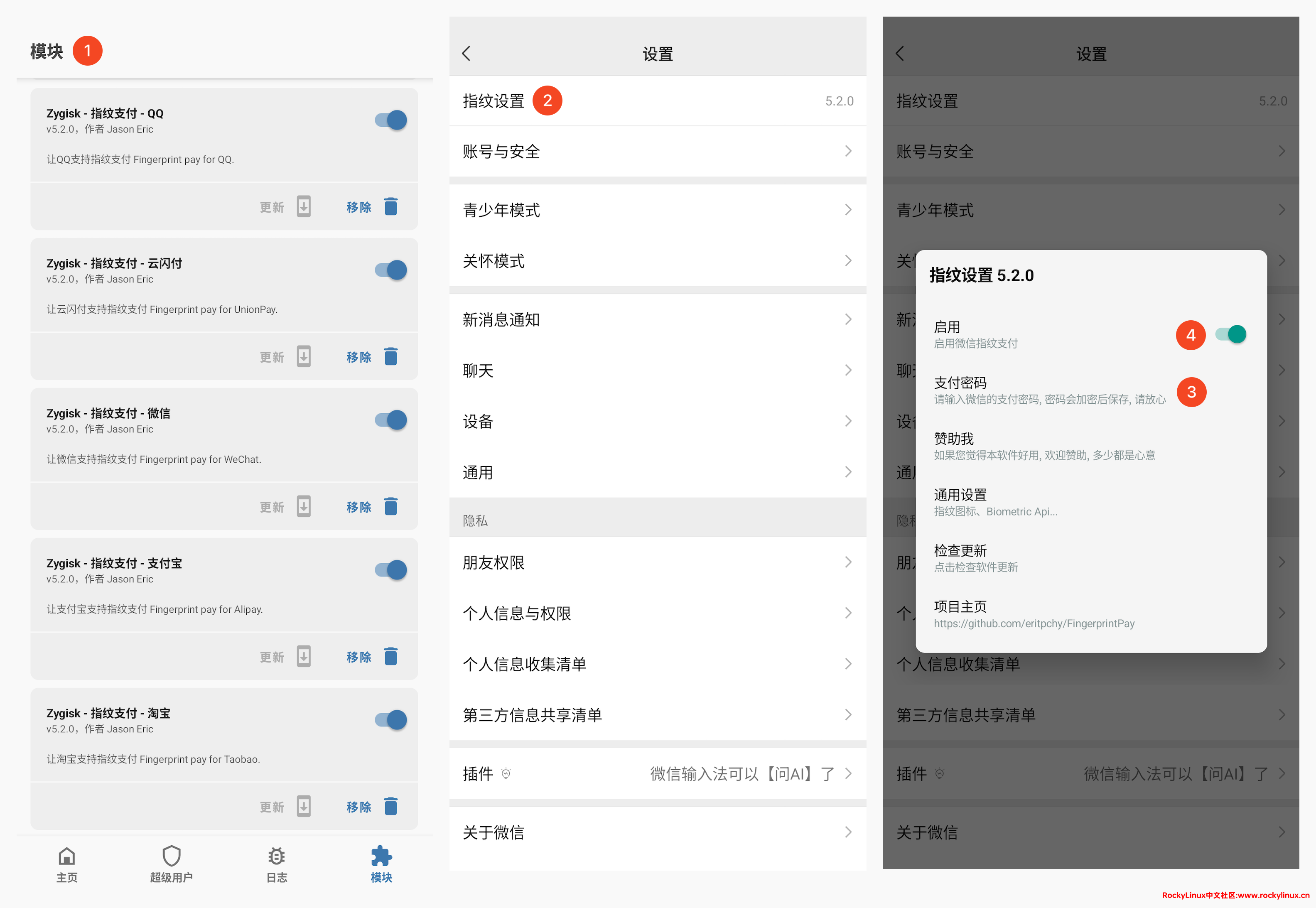 如下图 ID 1 所示,确保 Magisk 模块中对应指纹支付模块已经启用。