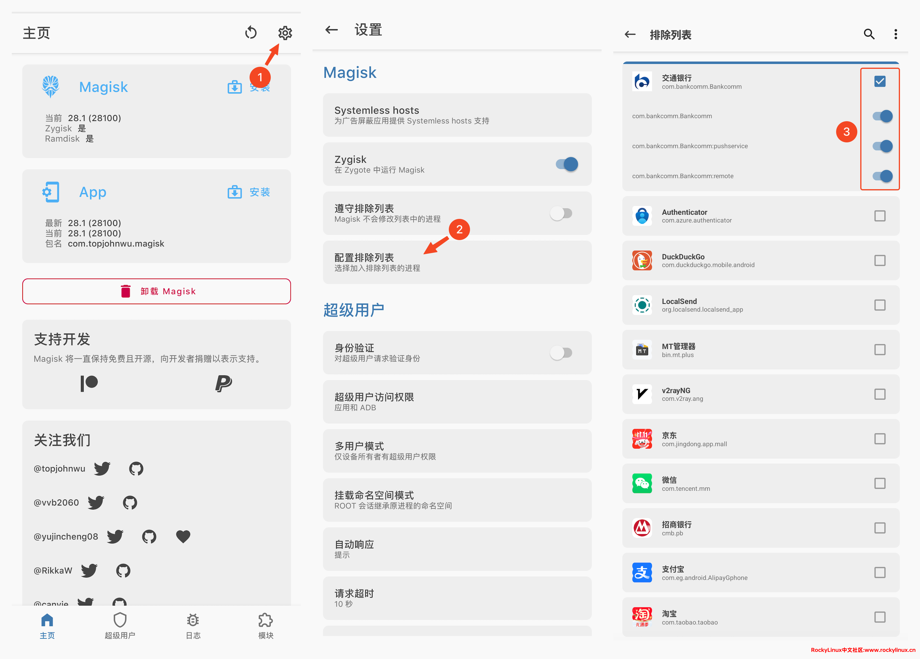 详细配置如下图所示,这里以排除 “交通银行” 邮箱为例,依次点击“设置 ”-- “配置排除列表” -- 勾选要隐藏 root 的应用(勾选所有选项,如图 ID 3 所示)。