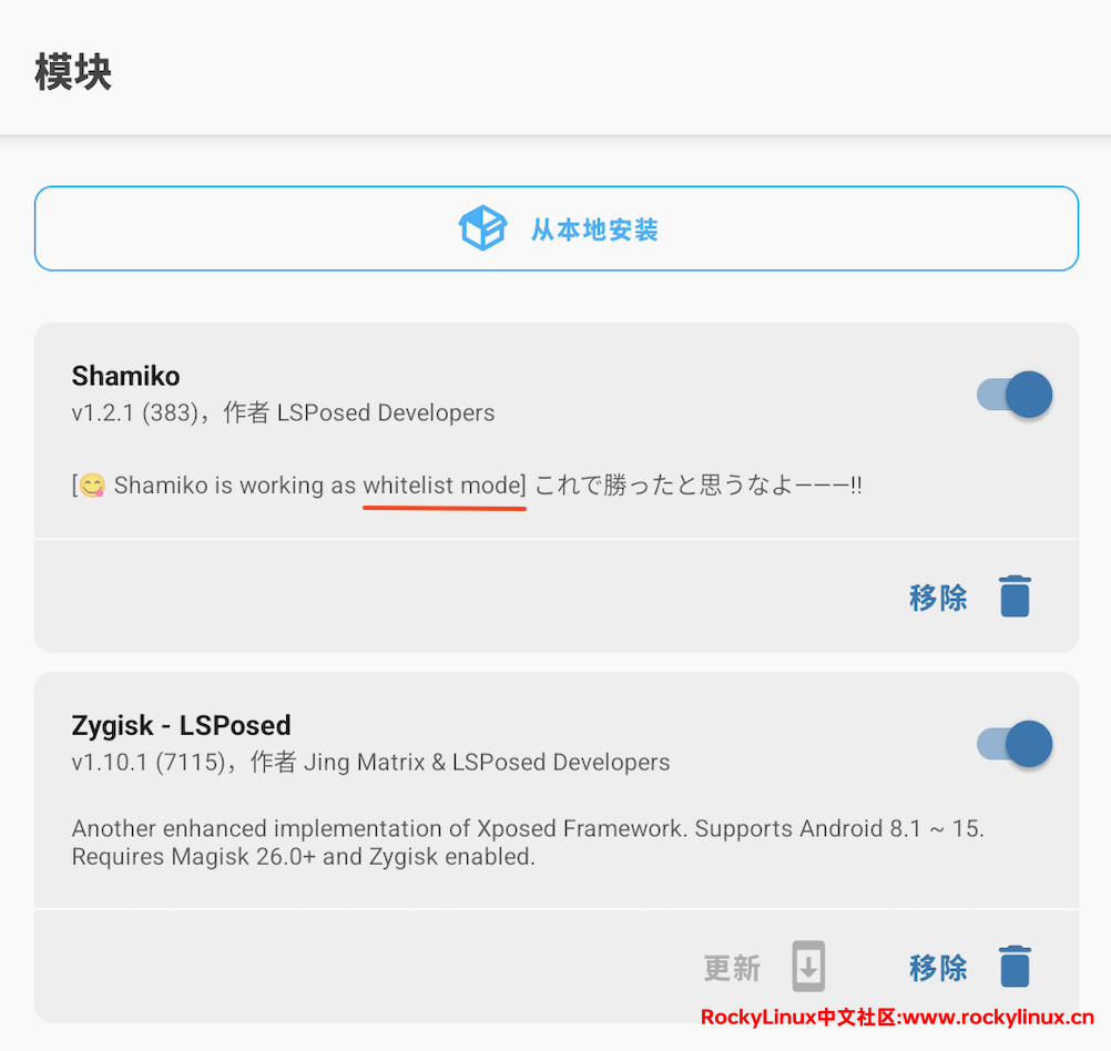 打开 Magisk -- 模块,Shamiko 显示 whitelist mode ,说明切换白名单模式成功。