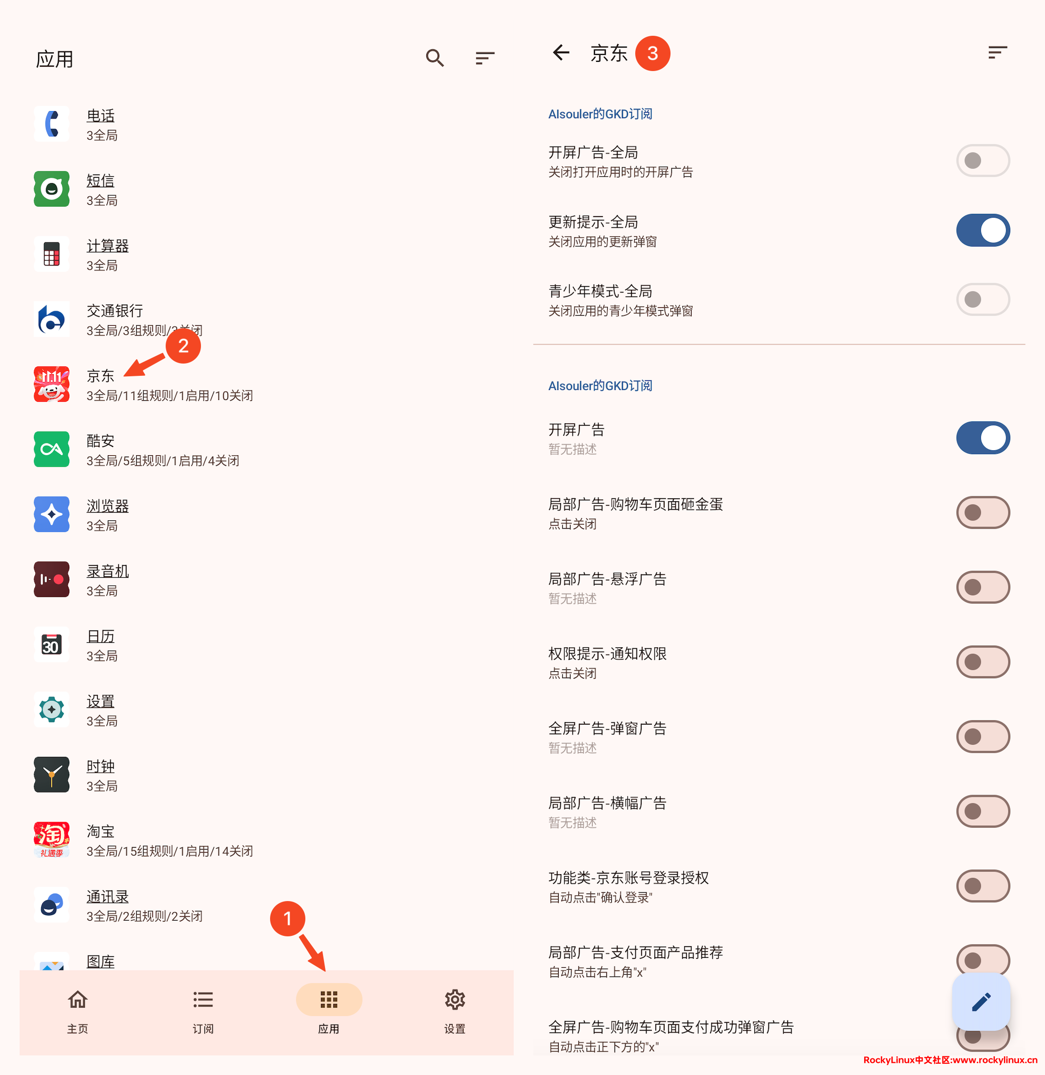 默认情况下,GKD_subscription 只开启了 开屏广告 限制,其它广告限制需要进入应用,然后选择对应应用进行设置,具体如下图所示。