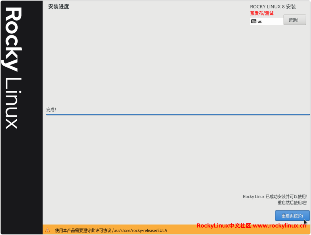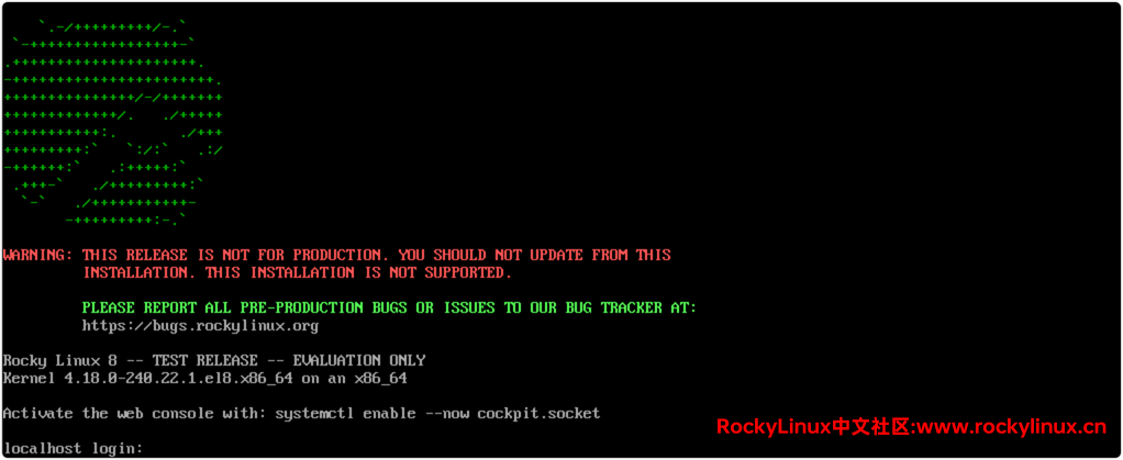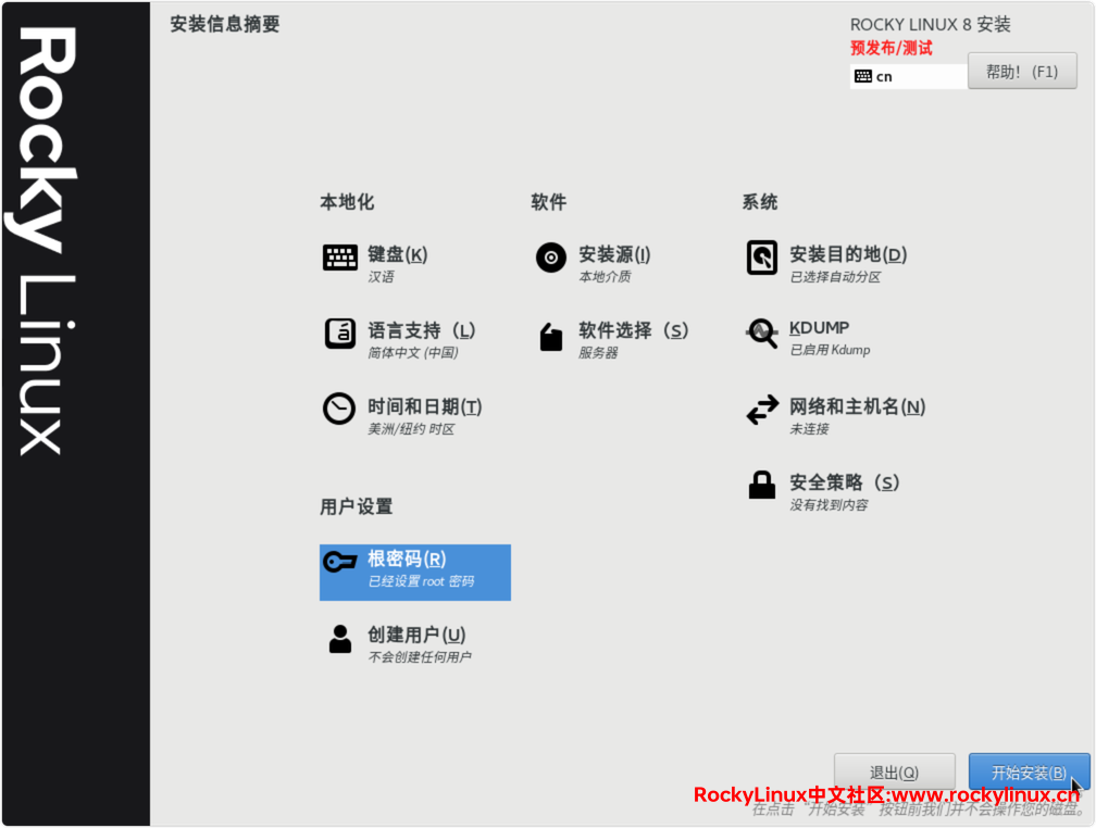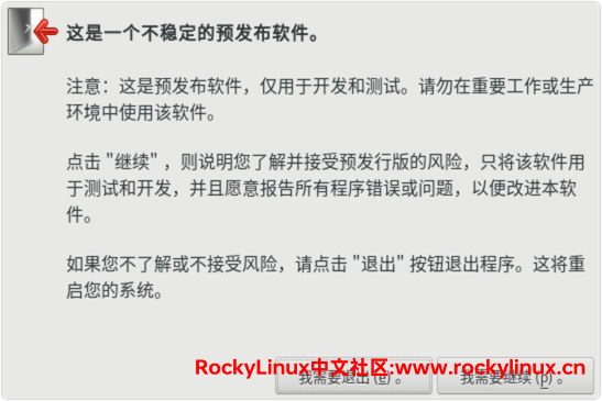 从整个安装过程来看,与 CentOS 8 没有太大区别,唯一的区别在于增加了两个警告信息,一个在安装前,一个在登录界面。