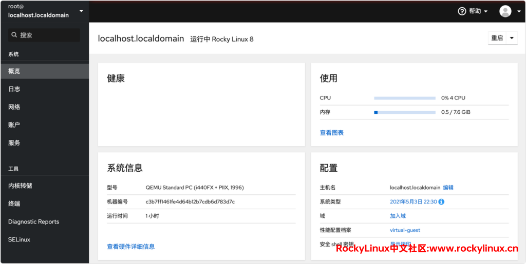在这里可以管理查看:健康状态、CPU、内存、系统信息、日志、网络、账户、服务、SELinux等信息。