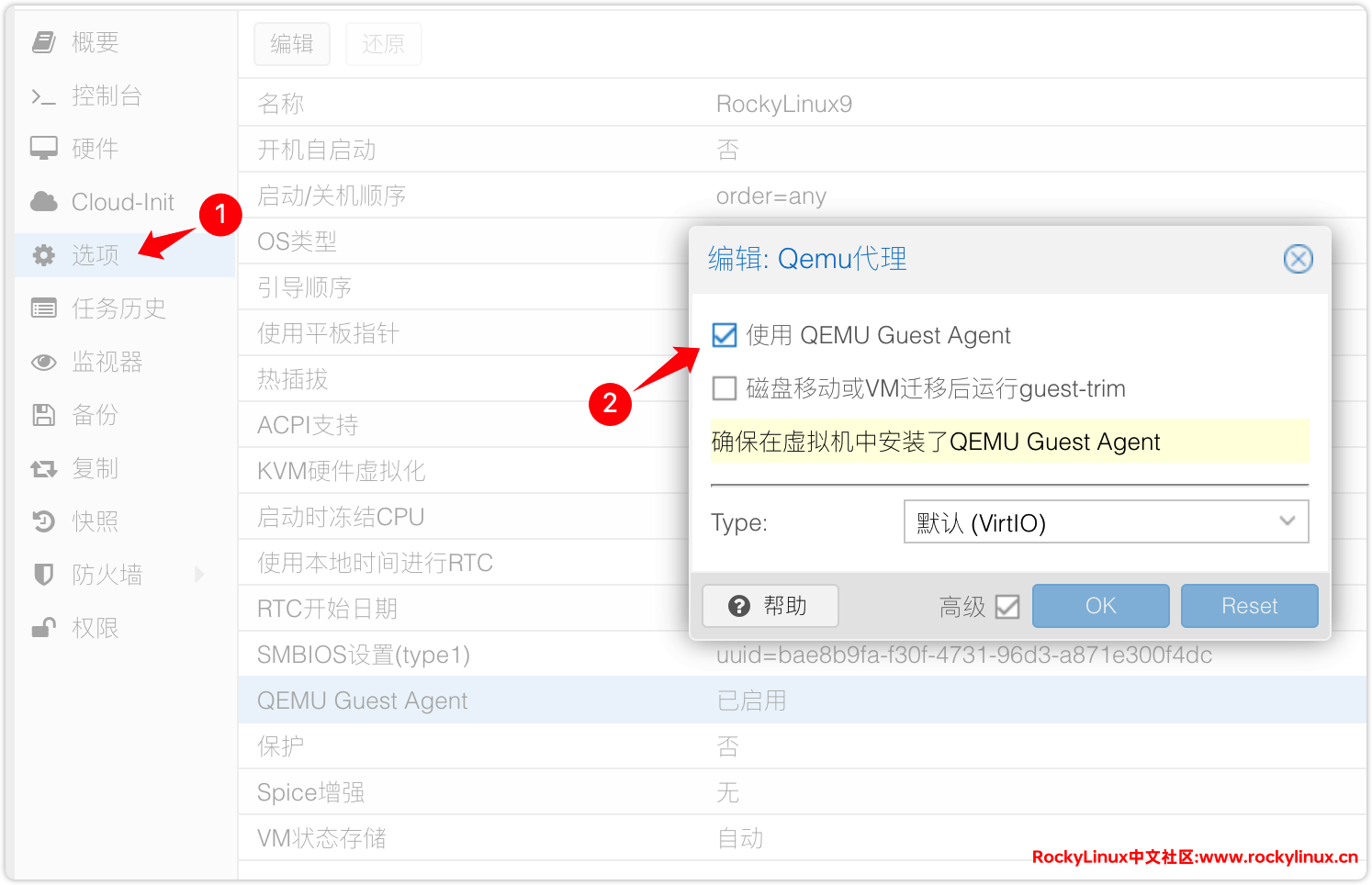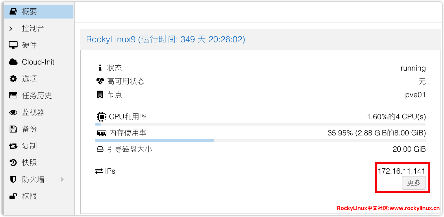 安装重启后,确保在[概要]中可以看到对应IP信息,如果无法看到对应IP信息,说明QEMU Guest Agent未启用,需要在[选项]中启用。